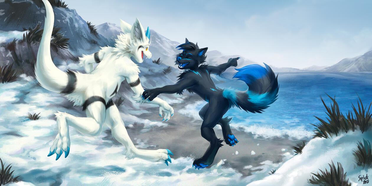 Illustrations that depict the characters from the waist up with scenery behind them, the light in the scene interacting with them. They make great lockscreens!